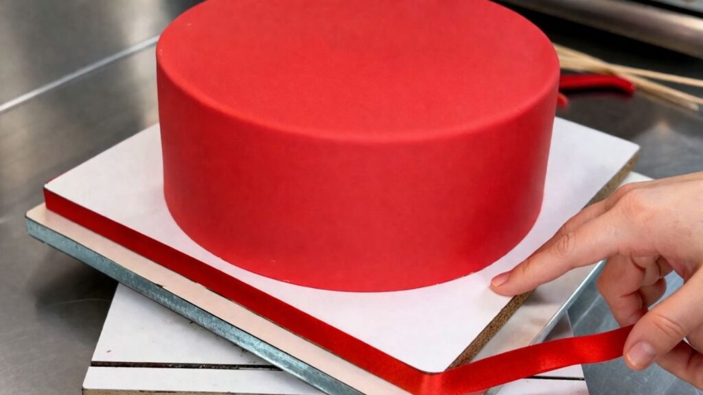 Before assembling your two-tier 40th birthday cake, start by decorating the cake board. Take your red satin ribbon and glue it around the edge of the cake board for a clean and polished finish that ties the whole design together.
